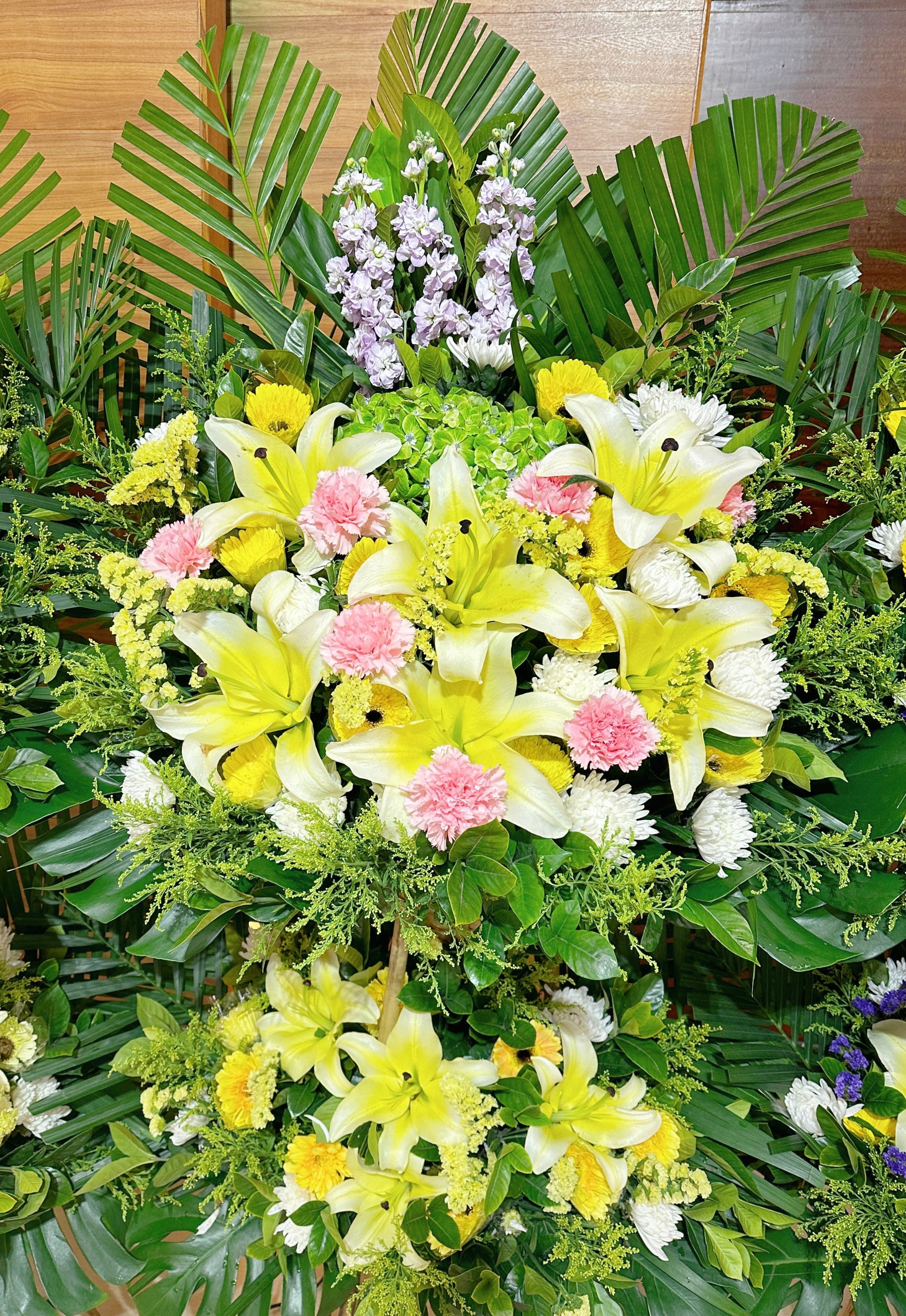 以百合、菊花與綠葉為主調,象徵純潔與懷念。