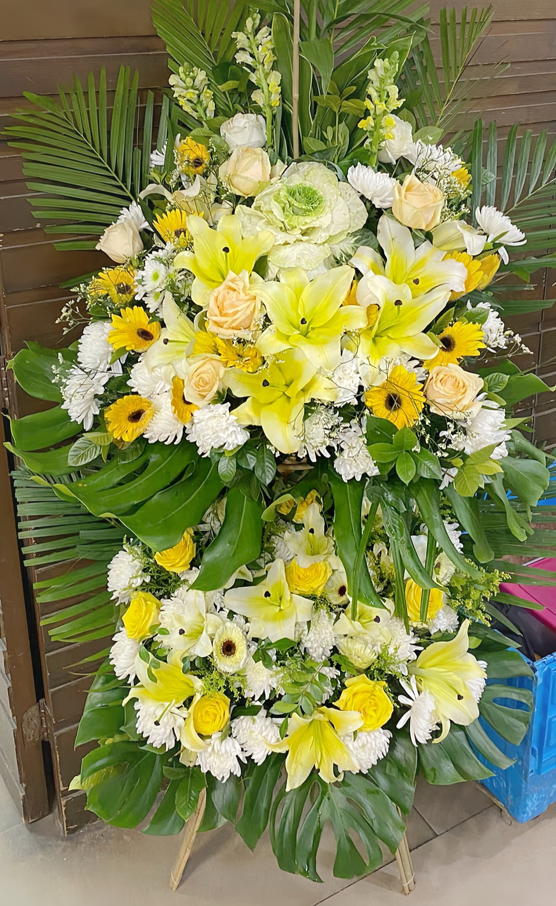 這款雙層帛事花牌,由專業帛事花店製作。即日送達世界殯儀館等 其他港九新界殯儀館,附免費敬意卡,
